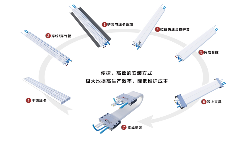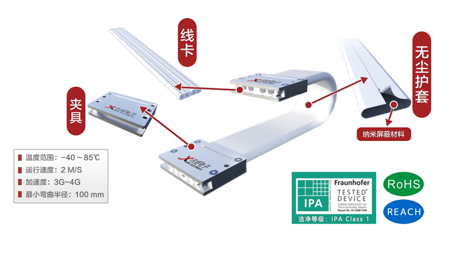 訊煜開放易安裝式無塵拖鏈(第3代無塵拖鏈)是一種滿足無塵環(huán)境下線纜防護及運動需求的產(chǎn)品,拖鏈自帶屏蔽抗干擾功能(內(nèi)層采用納米屏蔽材料,吸收拖鏈內(nèi)部線纜EMI竄擾)。易安裝式優(yōu)于封閉式拖鏈結(jié)構(gòu),外層護套采用拉鏈開口式結(jié)構(gòu),便于線纜的安裝和更換。中間線纜由柔性線卡分隔和固定,提高線纜排布的速度和美觀度,同時減少線纜絕緣層的磨損,延長線纜的使用壽命。支持多層疊加,支持龍骨支撐,滿足長行程應用場景。