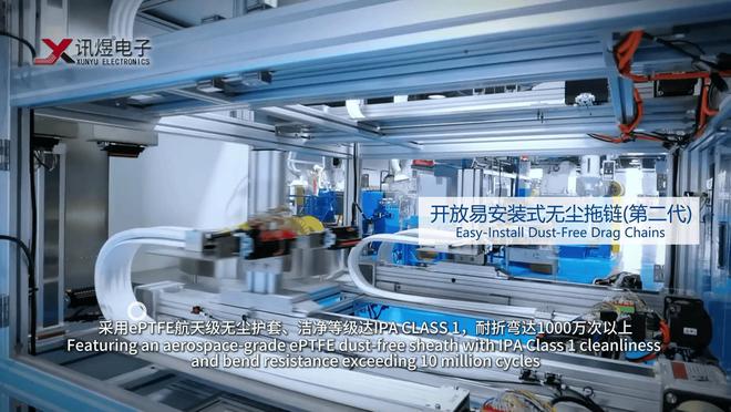 訊煜開放易安裝式無塵拖鏈 訊煜潔凈高柔運動排線,同樣采用ePTFE航天級材料,潔凈等級達IPA CLASS ONE,耐折彎達2000至3000萬次以上,實現更低的折彎高度、更小的運行阻力,滿足更小空間布線和更高定位精度需求。