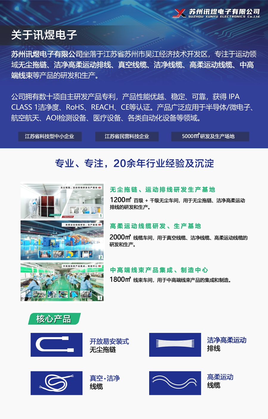 經(jīng)過20多年的沉淀與發(fā)展,目前訊煜電子已經(jīng)發(fā)展成為一家集無塵拖鏈、潔凈高柔運(yùn)動(dòng)排線、真空線纜、潔凈線纜、高柔運(yùn)動(dòng)線纜、中高端線束等產(chǎn)品的研發(fā)、生產(chǎn)、集成為一體的高科技企業(yè)。